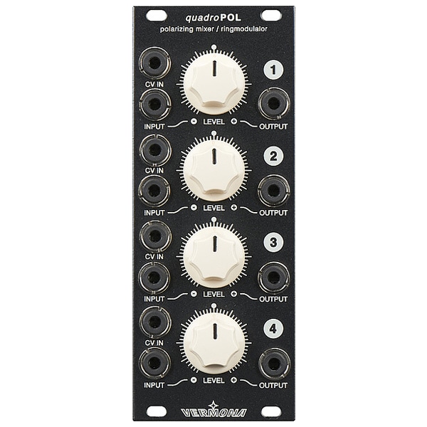 quadroPOL(クアドロポル)は4チャンネルのポラライザー/リングモジュレーターです。入力した信号を減衰させたり、逆相にして出力する回路を4チャンネル搭載しています。