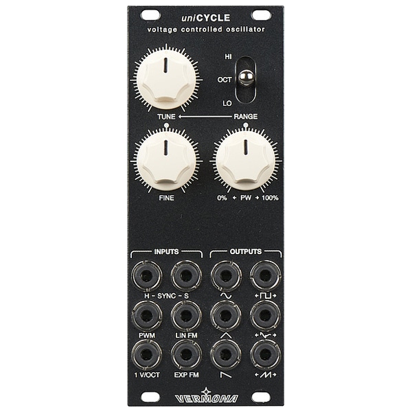uniCYCLE(ユニサイクル) は6種類の波形を出力できるアナログ・オシレーターです。10HPのコンパクトなサイズにハード/ソフトシンク、リニア/エキスポネンシャルFMなど一般的な機能を全て備えています。