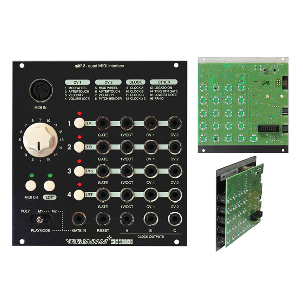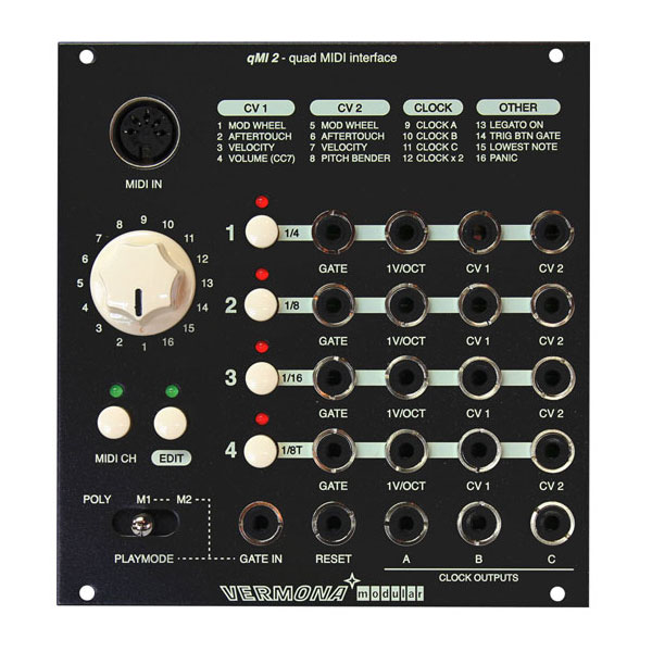 VERMONA 「qMI2 - Quad MIDI Interface」は最大4系統のCV/Gate Outputを同時に使用出来るポリフォニックMIDI to CV/Gateコンバーターです。アナログモジュラー・シンセサイザーやモノフォニックのセミモジュラー・シンセサイザーを複数台使用したポリフォニックでの演奏が可能になります。ポリフォニックだけでなく複数系統をユニゾン、または順番に発音させるモノフォニックモードも搭載。MIDIチャンネルを別々に指定すれば3ポリフォニック+モノフォニックなど変則的なセッティングも可能です。