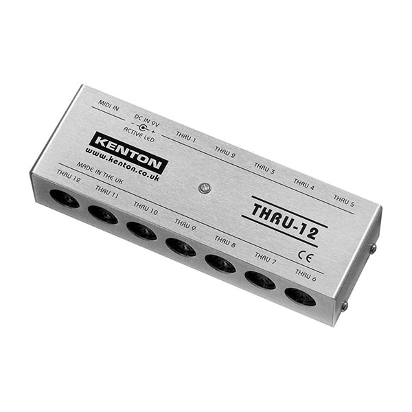 KENTON Electronics THRU-12 (スルー トゥエルヴ)は1系統の MIDI 入力を 12 系統に分配して出力する MIDI スルーボックスです。複数のMIDI機器を MIDI ケーブルで接続する際、MIDI機器のMIDI IN と MIDI THRU を使用して数珠つなぎにする方法が一般的です。しかし台数が多くなったり MIDI ケーブルが長くなると信号が遅延したり正常に受信しないなどトラブルの原因となります。