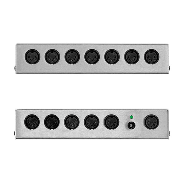 5 系統に分配する THRU-5 では THRU が足りない場合は、この THRU-12 や THRU-25 をご使用下さい。MIDI を搭載したシンセサイザーやエフェクター、アウトボードを多数使用する大規模なスタジオシステム、MIDI Show Control (MSC) を導入し多数の機器を制御する舞台装置、照明、演出効果のシステムに最適です。
