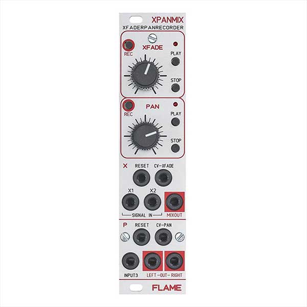 オーディオと CV を扱うことが可能で、入力できる電圧レンジは +-5V まで対応。X1とX2 2つの信号を同時にクロスフェード/パンニングできます。XFADE ノブまたは LFO など外部 CV を CV-XFADE へ入力してクロスフェード、PAN ノブまたは LFO など外部 CV を CV-PAN へ入力してパンニングを調整します。各トラックに用意された REC ボタンを押すと、ノブの動きをそれぞれ2分以上記録します。記録したノブの動きは PLAY ボタンを押してワンショットで再生するか、または PLAY ボタンを長押しするとループさせることができます。再生速度は再生時に調整できます。