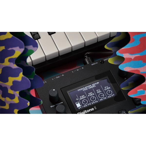 Digitone II には、パフォーマンスと演奏性を最大限に高めるツールが満載です。ノート編集により、コードのすべてのノートを徹底的に編集できます。各ノートのノート、長さ、速度、さらにはマイクロ タイミングを微調整できます。アルペジエーター ボタンを押して、リズムとメロディーのアイデアを探求してください。アフタータッチ、ピッチベンド、モジュレーションホイール、ベロシティとブレスコントロール、新しく追加されたキートラッキングのカスタマイズ可能なモジュレーション設定で、サウンドをさらに進化させましょう。それぞれに 4 つの割り当て可能なパラメータ デスティネーションと独立したデプスがあります。外部MIDI コントローラーを接続して、自由に操作してください。